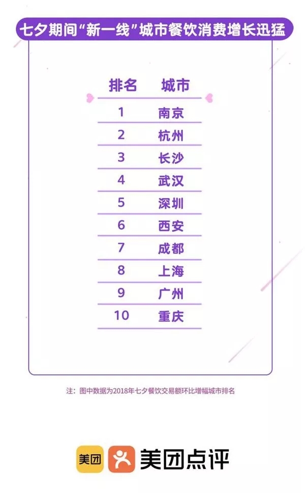 报告显示,2018年七夕当日环比前三日均值的餐饮交易额增幅榜上,南京、杭州、长沙、武汉均领先于一线城市,增幅超过100%。此外,西安、成都、重庆等城市的表现也可圈可点,增幅在90%以上,超过北京。