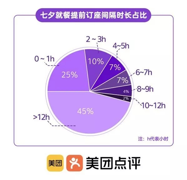 上海、北京、深圳、杭州、成都的人民更注重仪式感,是热衷提前预订前五的城市。此外,从提前订座的间隔时长来看,七夕期间,45%的订单是提前12小时以上预订的,占比高于平日。