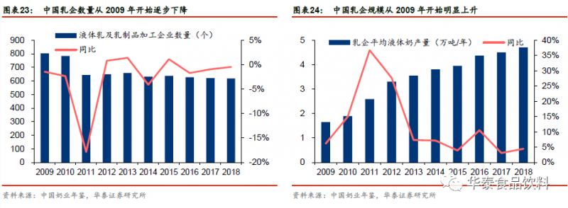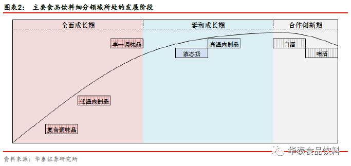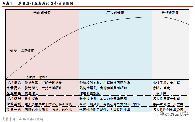 根据行业供需情况和竞争格局的不同,消费品行业陆续经历全面增长期、零和增长期和合作创新期。全面增长期里行业处于供不应求的状态,企业数量较快速度增长的同时大量企业能够实现业绩增长。零和增长期里供需失衡的情况逐步获得改善,企业数量的增速明显放缓,行业内的企业业绩表现出现分化。合作创新期里供过于求的情况开始出现,行业增长趋于停滞。企业数量开始见顶回落,行业内寡头的格局逐步成型,同时细分领域具有颠覆性创新能力的企业开始出现。我们认为中国乳业目前处于零和增长的末期,行业未来的机遇主要是龙头的平台化以及和特色型乳企的合作。
