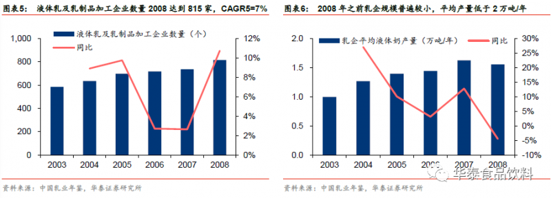 在乳业的发展初期,以达能为代表的外资企业进入中国先后与广州牛奶公司、光明乳业和蒙牛乳业合作,捕捉中国乳业发展机遇。由于全面增长期中市场处于供不应求的状态,供给效率更高、对供应链和终端陈列要求更低的常温奶发展势头更为迅猛,成为中国液态奶市场的主流产品,以常温奶作为战略产品的伊利股份增长速度明显快于以低温奶作为战略产品的光明乳业。2008年中国市场爆发的乳业食品安全问题则标志着行业的全面增长期步入尾声,行业份额开始向抗风险能力更强、规模优势更明显的龙头企业集中。