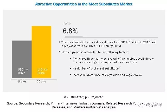 而这一被称为全新蓝海的未来食物市场近年来也逐渐成熟,据Markets and Markets报告,2018年全球肉类替代品市场约为46.2亿美元,而这一数字将在2023年达到64.3亿美元。