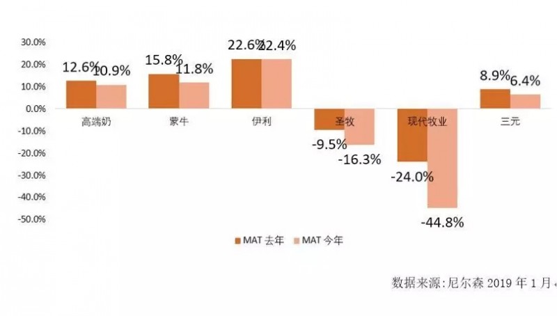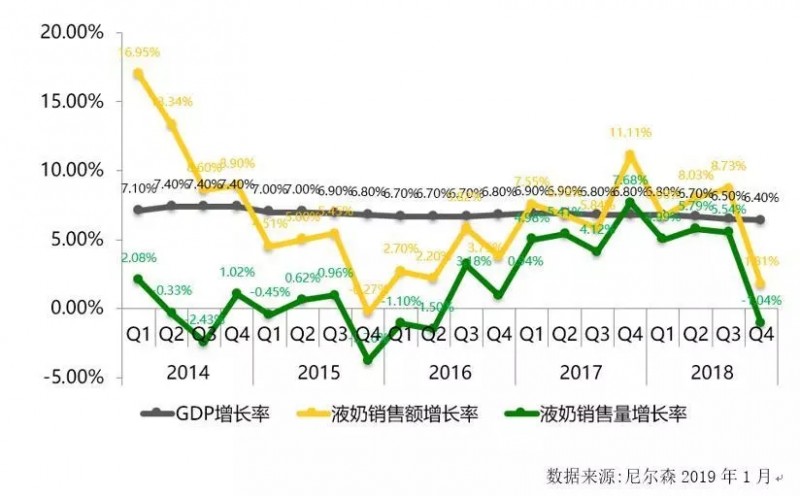 从尼尔森乳业五年综合数据可以看出,14-15年乳业整体都处于下滑状态,甚至一度跌破了GDP的年度增速。从16年开始行业整体开始回暖,一直到17年4季度,液奶整体销售额增长11.11%,销量增长7.68%。按照市场预期,17、18年乳业整体能够持续突破GDP增速。但预料不到的是,18年开始,乳品市场又开始进入缓慢的生长周期。