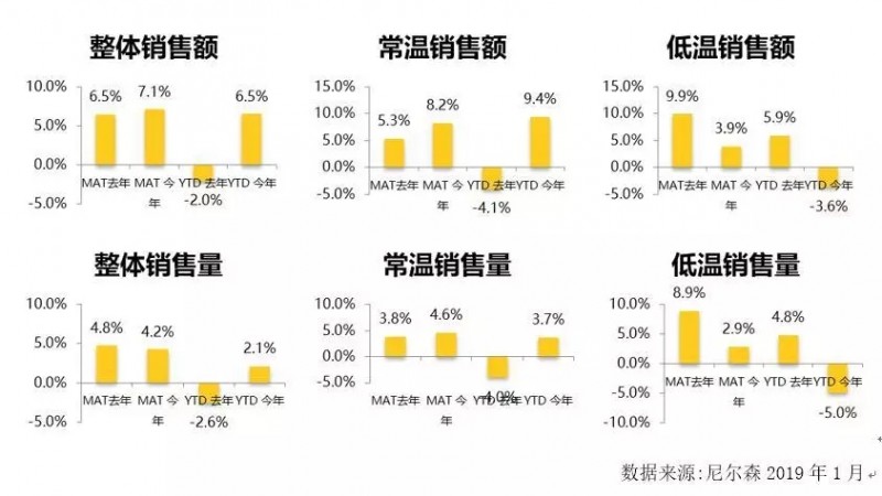 从销量整体来看,2018年液奶整体销售额增长7.1%,销售量增长4.2%,行业整体处于低速增长状态,但是从液奶常低温整体数据来看,低温增长远逊于常温,其中低温奶销售额增长3.9%,销售量增长2.9%;而常温销售额增长8.2%,销售量增长4.6%,足足是低温增幅的2.5倍。所以18年整体行业的成长很大一部分来源于常温的拉动,而常温恰好是传统两强的传统强项。