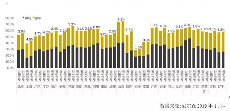 2018年行业整体销售额增长4.2%,但是反观两强,伊利销售额增长16.87%,蒙牛增长14.7%,足足是行业整体增速的4倍左右。而从上市区域乳企的财报披露来看,仅有少部分具有差异化特色的企业还在快速增长,而很多区域乳企的增长不是很理想。同时两强在液奶整体中的份额三年间增长了5%,达到55%左右,同时细分到每个省市的液奶占比,两强也是绝对领先。
