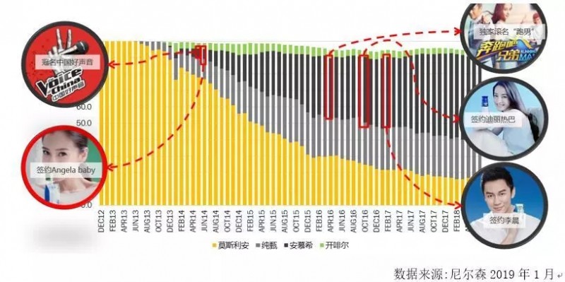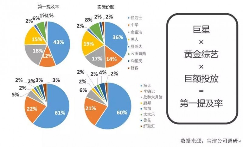 在快消品领域有着一个不成文的市场定律,你的市场份额就约等于你的品牌第一提及率,而构成品牌第一提及率的核心要素就是品牌的明星代言、黄金综艺、巨额投放,牙膏的品牌第一提及率是佳洁士,所以佳洁士的市场份额最高;酱油品类的第一提及率是海天,所以海天的市场份额最高。对于同样是快消品的乳品而言,市场同样如此。