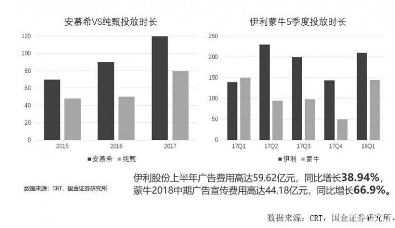 分析两强财报,仅18年上半年伊利广告费用高达59.62亿,同比增长38.94%;蒙牛2018年中期广告宣传费用高达44.18亿,同比增长66.9%。同时从安慕希和纯甄的投放时长来看也是遥遥领先于市场整体。所以两强的巨额市场投放迅速带来了纯甄和安慕希的品牌曝光,占领了常温酸奶的第一提及率。