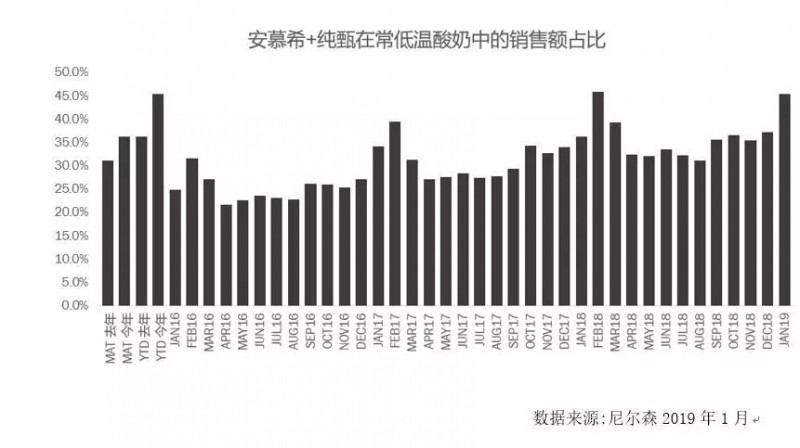 两强通过海量高空投入带来的就是常温酸奶的市场第一提及率,让安慕希和纯甄的市场份额从15年开始迅速反超昔日常温酸奶霸主莫斯利安,通过尼尔森数据可以看出,安慕希和纯甄的市场份额不仅是在常温酸奶中占比高,在常低温酸奶整体中同样超过了35%。所以这样带来的结果是常温酸奶切割了低温酸奶的市场份额,18年低温酸奶罕见性地出现了销量下滑。