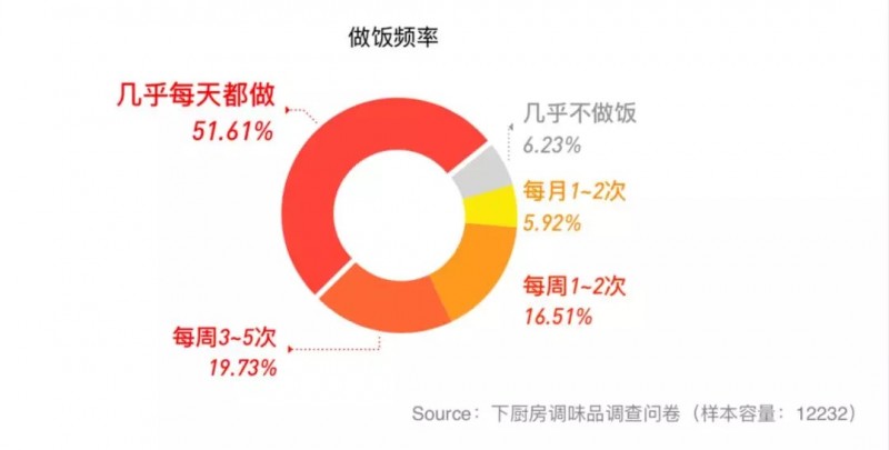 51.61% 的受访用户几乎每天都做饭,近 20% 的用户每周做饭 3—5 次。