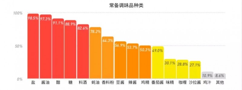 超过 80% 的用户家中常备盐、酱油、醋、糖、料酒;