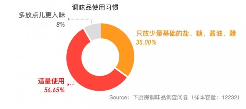 在轻食和回归食物本味成为风尚的当下,人们越来越崇尚健康的生活方式。习惯多放调味品的用户不足一成;56.65% 的用户选择适量使用调味品,认为合理使用能更好增加菜品味道;而近四成用户仅使用基础调味品。