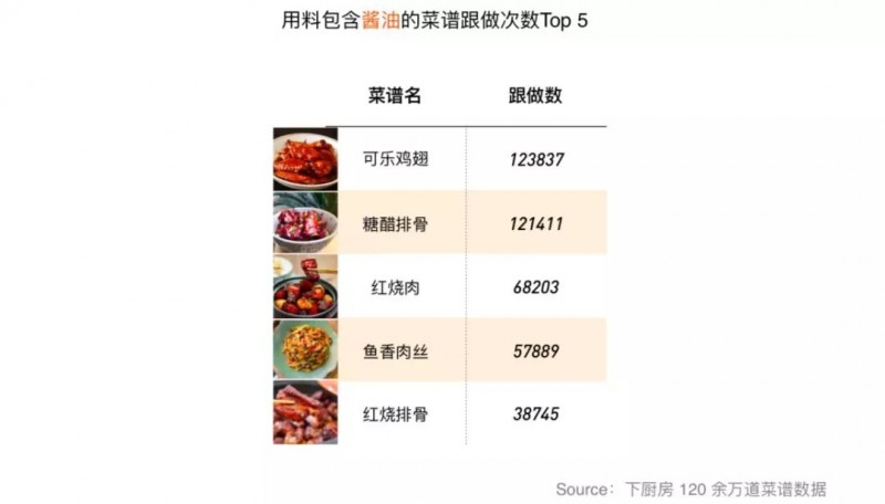 红烧类硬菜,完成时往往更有成就感,用户分享热情更高。多达 123837 位下厨房厨友跟做了配料中用到酱油的可乐鸡翅菜谱,并上传作品图。
