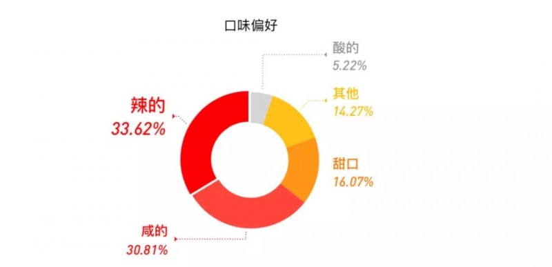 湖南人最爱吃辣,喜欢辣味的人数占比高达 66%;排名第二的是四川人, 60.74% 选择了最喜欢辣味。这两个省份是名副其实的“三颗辣”地区。