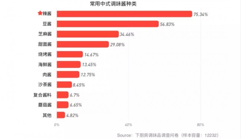 从用户常用中式调味酱的种类看,辣酱以 75.34% 的人数占比登上榜首。