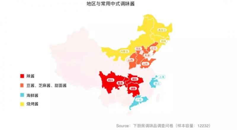京津冀等北方地区使用豆酱、芝麻酱、甜面酱的用户占比更高;