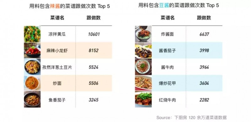 通过观察下厨房用料中包含“老干妈”的菜谱跟做情况,发现跟做数 Top3 的菜谱分别是:凉拌黄瓜、孜然洋葱土豆片、世界上最好吃的炒面。