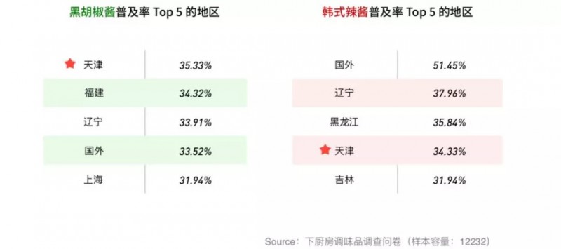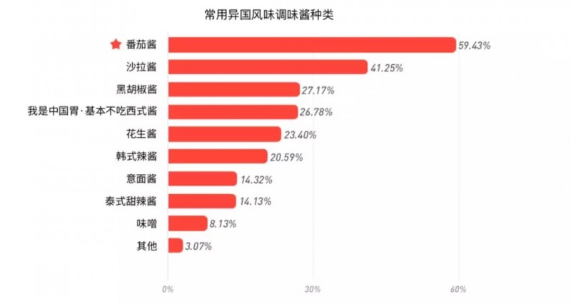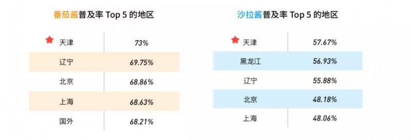 常备异国风味调味酱前三名的番茄酱、沙拉酱、黑胡椒酱,天津人在使用人数占比上均位列第一;