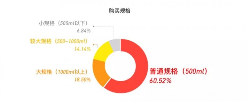 购买规格上,以酱油、醋为例, 60.51% 的用户倾向于购买 500ml,这也是市面上最常见的规格。