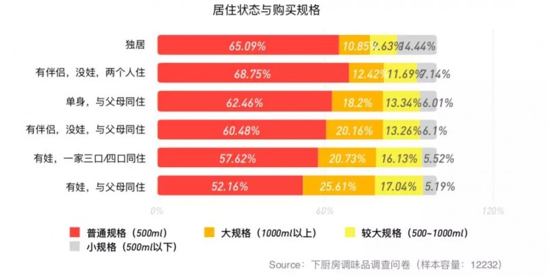 超过 30% 的用户倾向于购买较大规格(500—1000ml)、大规格(1000ml以上),这部分用户做饭频率高(几乎每天都做)、家庭成员多(有娃或与父母同住),消耗调味品更快。