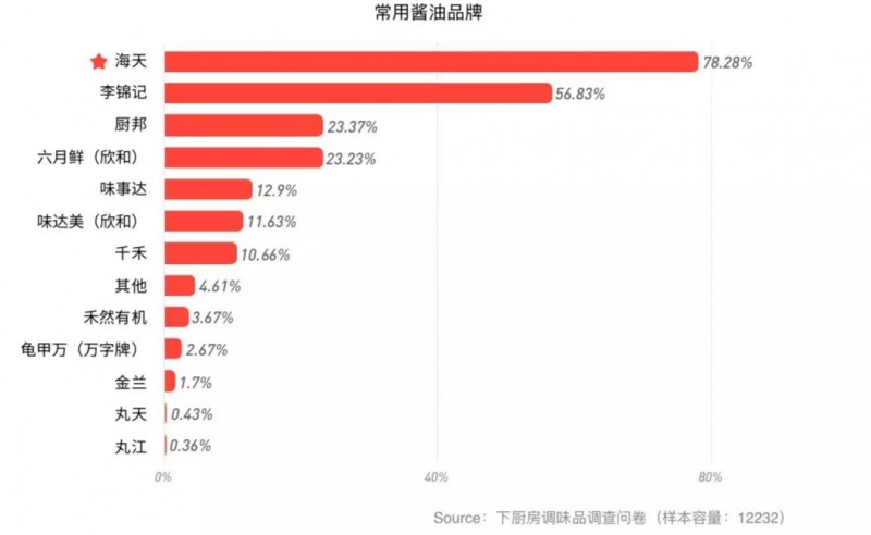 酱油品牌集中度较高,海天以 78.28% 的绝对优势领跑;