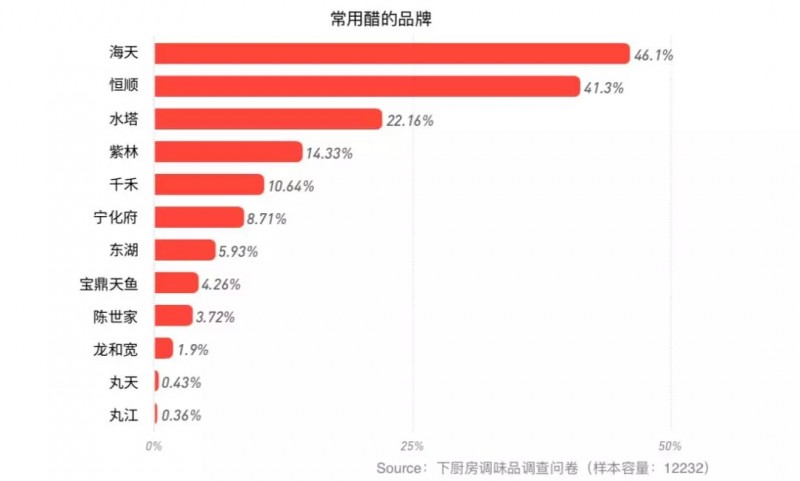 46.1% 的用户常用海天,海天以 4.8% 的微弱优势领先于恒顺。