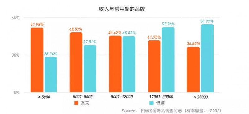 醋的品牌中,海天普及度更高;恒顺在高收入用户群体好感度更高。