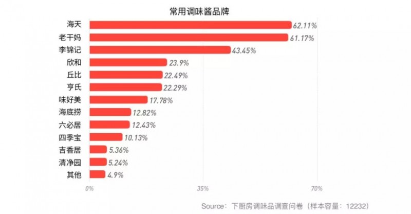 海天以 62.11% 的人数占比排名第一,老干妈以不足 1% 的微弱劣势屈居第二,李锦记以 43.45% 的使用人数位列第三。
