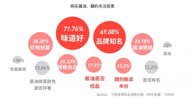 味道好、品牌知名,是用户购买酱油、醋最关注的两个因素。