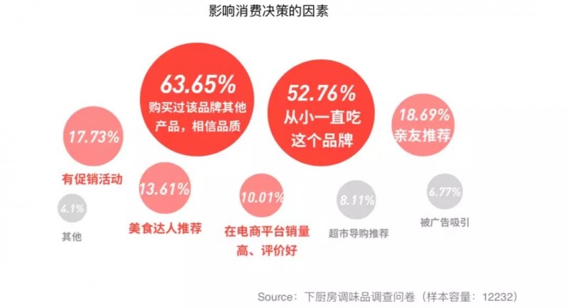··品牌为王。选购调味品时,用户最关注的两个因素:味道好;品牌知名。而用户作出消费决策的最关键影响因素是购买过该品牌其他产品。