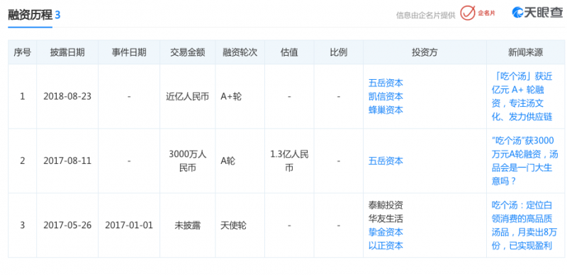 2018 年 3 月,主打“煲汤+饭”的“吃个汤”拿到近亿元 A+轮融资,资方为凯信资本等。