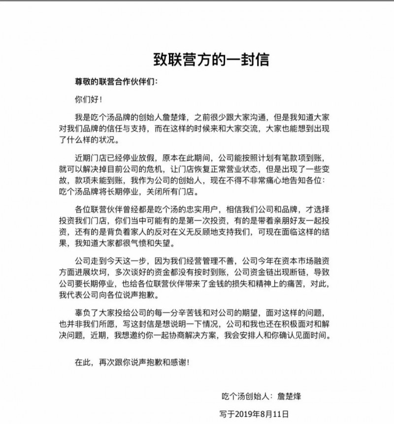 据创始人詹楚烽发给联营者们的公开信,“公司今年在资本市场融资方面进展坎坷,多次谈好的资金,都没有按时到账。公司资金链断裂,导致要长时间停业。”