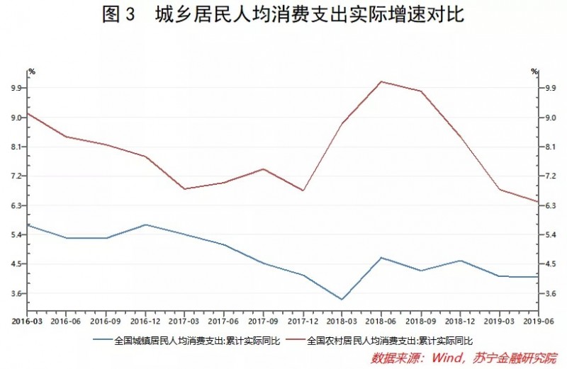 我们不妨对城乡居民的收入和支出状况做一番考察。根据国家统计局有关数据,近几年的农村居民人均可支配收入实际同比增速一直显著高于城镇居民,相应地,农村居民人均消费支出实际同比增速也高于城镇居民(参见图2、图3)。