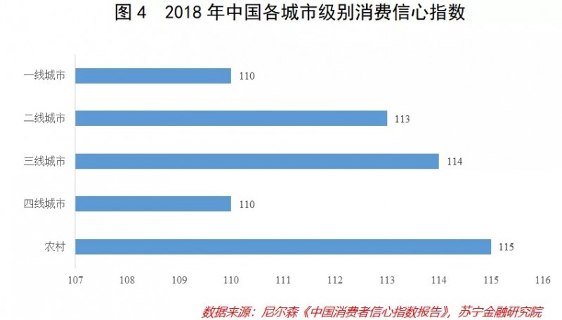此外,低线城市和地区大多房价较低,相当一部分居民无需为巨额的房贷焦虑,从而拥有颇为旺盛的消费意愿,敢于花钱,甚至不输那些每个月去了房贷就所剩无几的一二线人群。尼尔森发布的《中国消费者信心指数报告》显示,2018年,一线城市居民的消费信心是最弱的,而三线城市与农村居民的消费信心更加强烈(参见图4)。