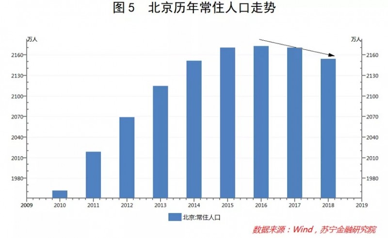 近几年,受房价房租高企、交通拥堵、空气质量打折等负面因素的影响,叠加有关部门的政策调控,很多一二线城市的外来常住人口正在减少,不少人喊出了“逃离北上广”的口号。典型如北京,自2017年起,其常住人口规模已连续两年呈收缩态势(参见图5)。