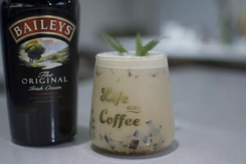 2.取雪克杯,茉莉绿茶/四季春乌龙奶基底、果糖、百利甜、咖啡力娇酒、冰块,雪克后出杯即可。