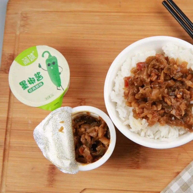 一粒简妹墨椒酱,可以放口袋、放手袋、放背包、上飞机,满足年轻人正餐、外卖、聚餐、出差、送礼等各种场景。
