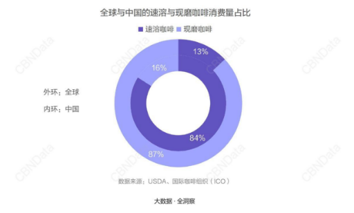 咖啡是雀巢的高增长产品之一,特别是速溶咖啡,在中国市场榜上有名。据CBNData第一财经商业数据中心报告显示,从咖啡引用结构来看,全球范围内速溶咖啡占比小于13%,而中国市场则相反,速溶咖啡占据了84%的市场份额。