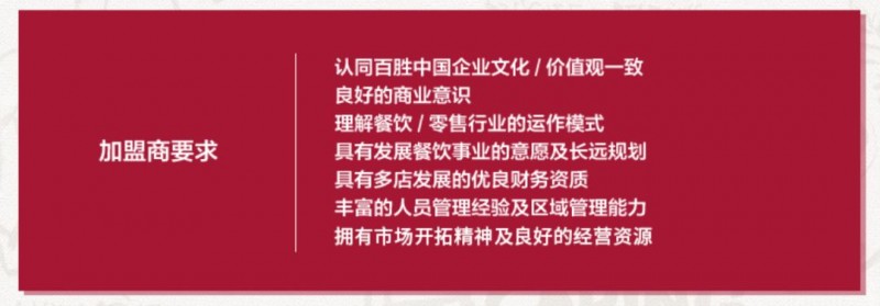 相比很多“零门槛”的餐饮加盟品牌,百胜中国对于加盟商的要求极高,甚至高到“变态”,对加盟商的资金、价值观、管理经验、管理能力、经营资源等都有很高的要求。