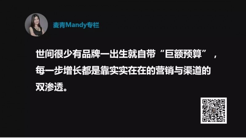 万丈高楼平地起。世间很少有品牌一出生就自带“巨额预算”,每一步增长都是靠实实在在的营销与渠道的双渗透。在有限条件下要做到尽可能的“大渗透”,比干等抱怨没钱做渗透,更有实战价值。