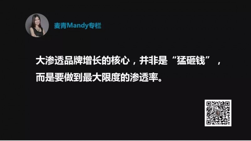 大渗透品牌增长的核心,并非是“猛砸钱”,而是要做到最大限度的渗透率。无论方式是通过“猛砸钱”、或“巧砸钱”,或是压根不砸钱,总之结果只要能促进渗透率的提升,才是最重要的。