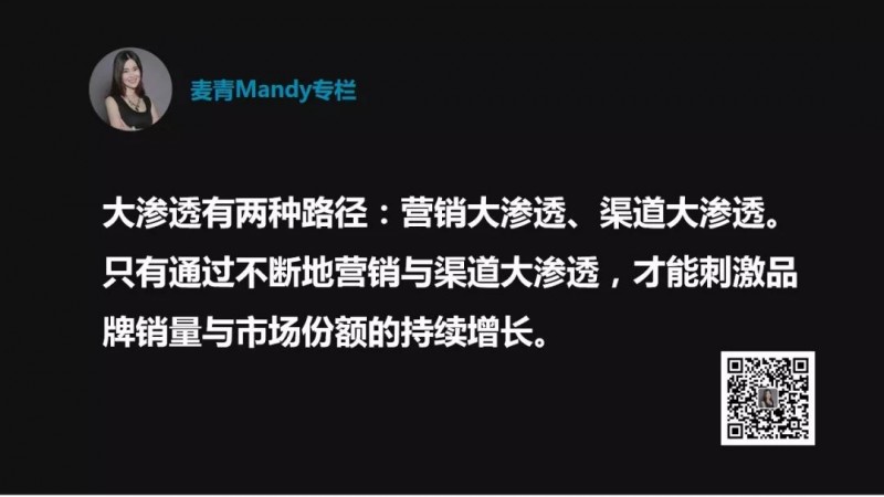 大渗透有两种路径:营销大渗透、渠道大渗透。只有通过不断地营销与渠道大渗透,才能刺激品牌销量与市场份额的持续增长。