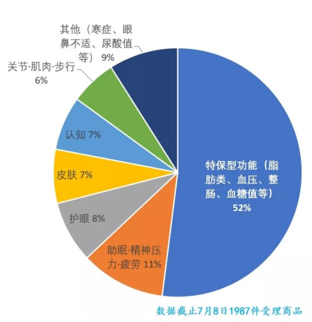 从受理的功能性标示食品类型来看,特保型功能(减脂、降血压、肠道消化、降血糖)、助眠/抗疲劳/缓解压力、护眼、护肤、提高认知功能、保护关节是最主要的功能诉求。