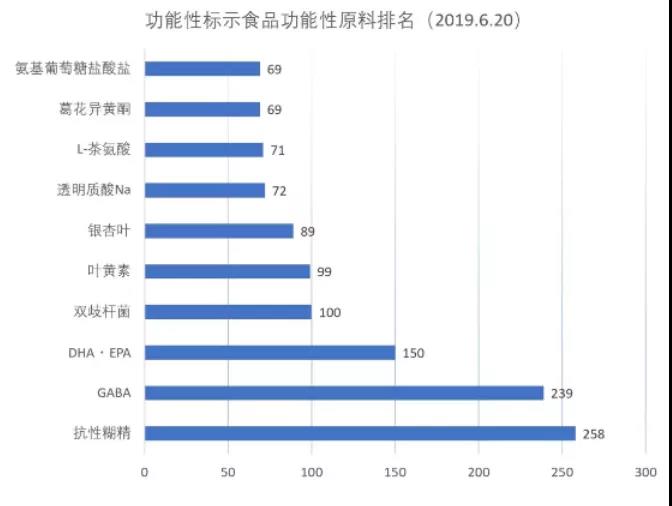 其中,抗性糊精、GABA、DHA/EPA、双歧杆菌、叶黄素、银杏叶、透明质酸Na、L-茶氨酸、葛花异黄酮、氨基葡萄糖盐酸盐是备案排名前十位的功能性原料。