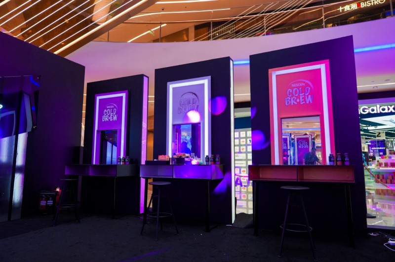 除了以上细节处的元素融合,雀巢在线下体验的选址上也是诚意满满。选在了陆家嘴L+Mall这个人流量较大的商圈,地铁二号线直达,五楼中厅的是个开放的圆形区域,上层的顾客在玻璃围栏向下眺望就能看到整个体验区。整个体验区没有采用全封闭设计,这种“犹抱琵琶半遮面”的设计,更撩拨了消费者进入体验区一窥究竟的好奇心。
