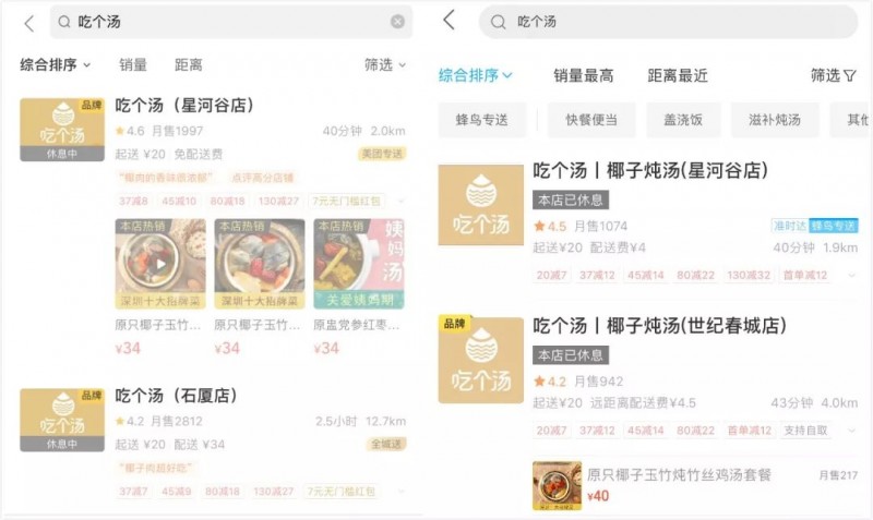 这家主打“原只椰子炖汤”的明星企业,号称1年卖出400万份网红汤,无论在用户还是创投圈中知名度都极高。但如今,投资界(ID:pedaily2012)分别在美团外卖、饿了么平台搜索吃个汤,结果显示,所有门店均处于休息中。