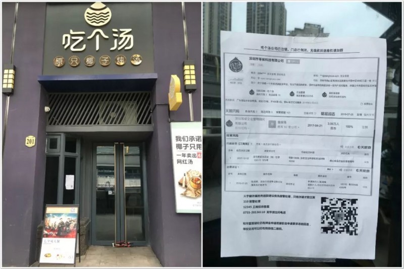 投资界(ID:pedaily2012)记者实地探访深圳龙华区吃个汤门店,发现该店已经关闭,门上贴有一张A4纸,页眉处写道:吃个汤公司已注销,门店已倒闭,充值款回退维权请加群。