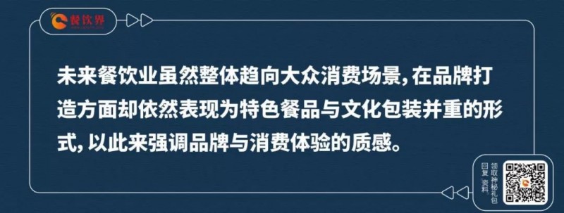 并且,遵循主流消费人群——中产阶级相较于物美价廉的高性价比产品更愿意接受质优价高产品的商业逻辑,未来餐饮业虽然整体趋向大众消费场景,在品牌打造方面却依然表现为特色餐品与文化包装并重的形式,以此来强调品牌与消费体验的质感。