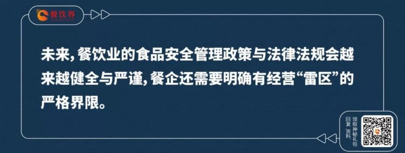 并且,未来,餐饮业的食品安全管理政策与法律法规会越来越健全与严谨,餐企还需要明确有经营“雷区”的严格界限。