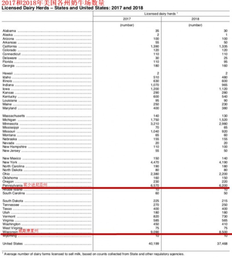 同时,美国的奶牛场也在减少。美国农业部数据显示,2017年全美奶牛场有40199个,2018年这一数字下降为37468,一年之间减少了2731个。