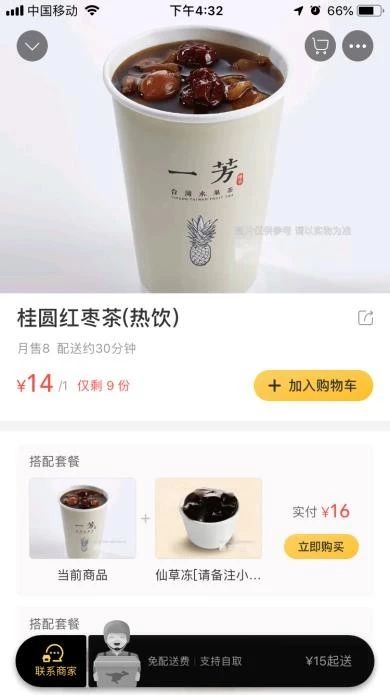 一芳的桂圆红枣茶(热饮),搭配马蹄露、仙草冻以及白桃丁,在满足养生需求的同时也满足了口欲。