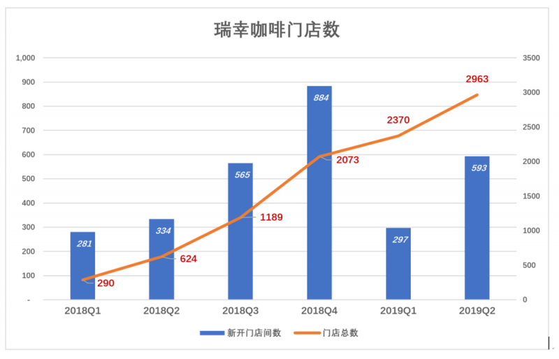 2018年,瑞幸新开门店数量达2064间,年末门店总数达2073间。2019年Q1,新开门店数仅为297,有必要“科普”的是春节总在每年的一季度。2019年Q2,新开门店593间,比2018年Q2多开259间。截至6月30日,瑞幸咖啡门店总数达到2963间。
